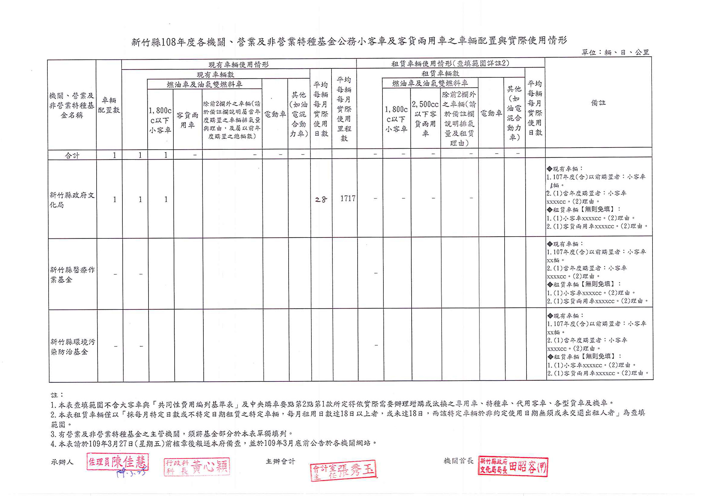 新竹縣108年度各機關、營業及非營業特種基金公務小客車及客貨兩用車之車輛配置與實際使用情形