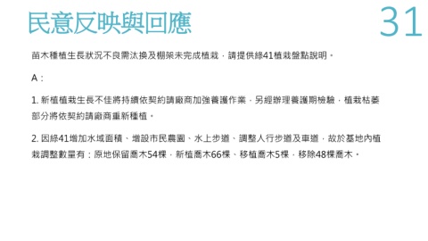 民 意 反 映與回應 31 苗木種植生長狀況不良需汰換及棚架未完成植栽,請提供綠41植栽盤點說明。 A: 1. 新植植栽生長不佳將持續依契約請廠商加強養護作業,另經辦理養護期檢驗,植栽枯萎 部分將依契約請廠商重新種植。 2. 因綠41增加水域面積、增設市民農園、水上步道、調整人行步道及車道,故於基地內植 栽調整數量有:原地保留喬木54棵,新植喬木66棵、移植喬木5棵,移除48棵喬木。